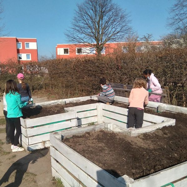 Mit viel Arbeitseifer wurde der Schulgarten von Unkraut befreit, Pflanzen wurden versetzt und das Hochbeet mit Erdbeerpflanzen bestückt. Das Ergebnis ist ein einladender "Naschgarten", der nicht nur im Frühling und Sommer Freude macht.