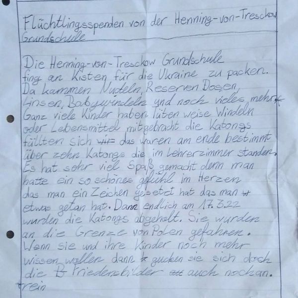 Im März haben wir zu Sachspenden für die Menschen aus der Ukraine aufgerufen. Das Ergebnis war beeindruckend. Kistenweise stapelten sich Hygieneartikel, Konserven, Windeln etc. im Mitarbeiterraum der Henning-von-Tresckow-Grundschule. Am 17. März wurden alle Spenden abgeholt und an die polnisch-ukrainische Grenze gefahren. Eine Schülerin und ein Schüler aus unserem 4. Jahrgang haben ihre Eindrücke in einem Brief zusammengefasst (siehe unten). Wir bedanken uns bei allen, die bei dieser Aktion mitgewirkt haben. (März 2022)